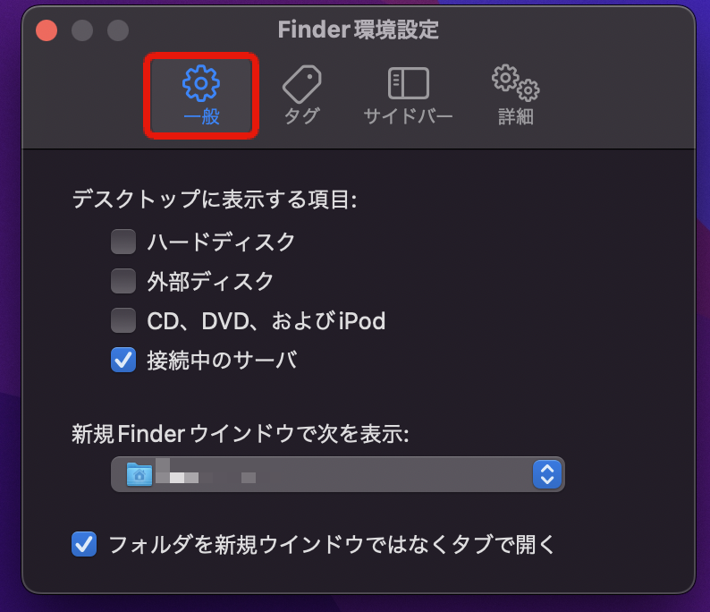 ここが今回の設定のキーポイント。「一般」タブの中に「デスクトップに表示する項目」というセクションがあります。