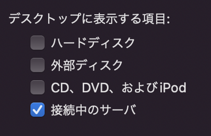 ここにはハードディスク、外部ディスク、CD、DVD、iPod、接続サーバなど、いろんなオプションがあります。この中から表示させたいものにチェックを入れてください。