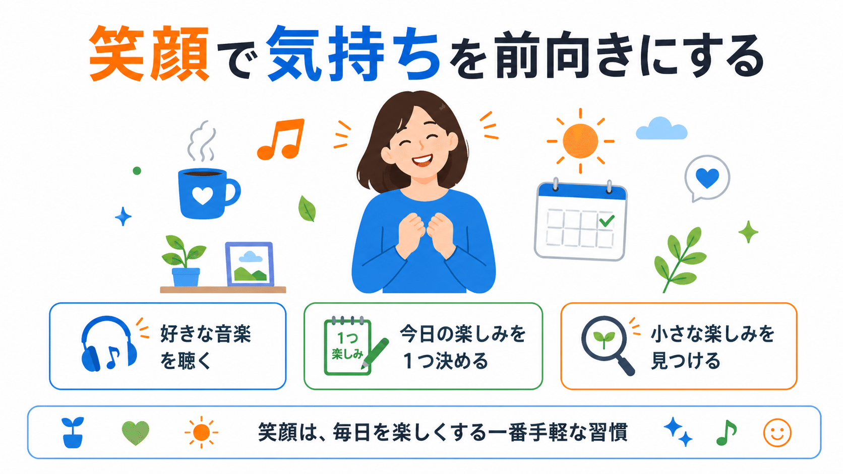 笑顔、気分転換、新しい挑戦、経験への投資で心を整える方法を紹介します。
